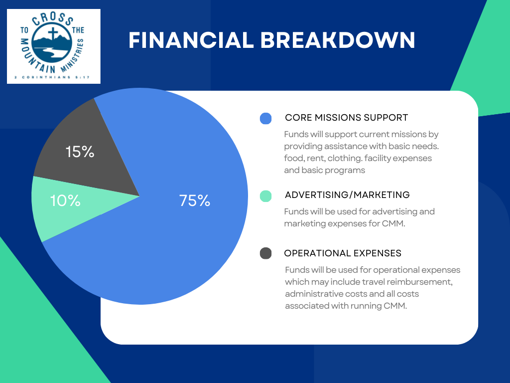 15% of your donation is used for all operating expenses of running Cross to the Mountain Ministries. This includes all printing, paper and office supplies for the ministry. It is also used for reimbursement for personal funds used to purchase food and gas for transportation while traveling for the missions.